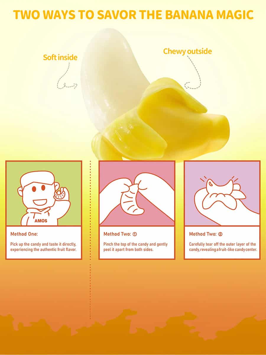 Κωδικός προϊόντος: ΕΙΔ0000739Γλυκά και φρουτένια ζελεδάκια με γεύση μπανάνας, που προσφέρουν μια παιχνιδιάρικη εμπειρία—ξεφλουδίστε ελαφρά για να απολαύσετε το λαστιχωτό εσωτερικό. Ιδανικά για κάθε στιγμή της ημέρας ως σνακ ή γλυκό.